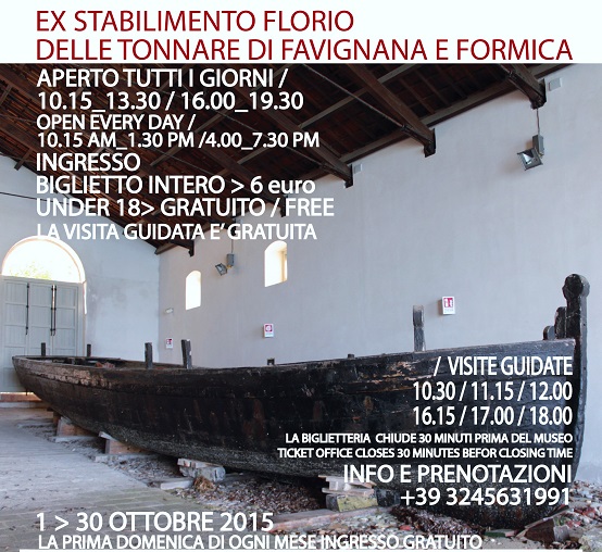 Cambiano gli orari d’ingresso, e delle visite guidate, da domani, giovedì 1° Ottobre, all’ex Stabilimento Florio delle Tonnare di Favignana e Formica, dove ad oggi, 30 settembre, il bilancio del 2015 è assolutamente eccezionale: 50.000 le visite ricevute. L’ex Stabilimento, dunque, uno dei musei siciliani più commentati su TripAdvisor e plurirecensito, con una sala conferenze attrezzata per una capienza di 400 persone, uno spazio destinato a museo, sale multimediali e altri spazi per diversi eventi etno-culturali, e con le sue note attrattive premiate da visite costanti durante tutta l’estate, sarà aperto, fino al 30 ottobre prossimo, tutti i giorni, dalle 10.15 alle 13.30 e dalle 16 alle 19.30. Le visite guidate sono in programma alle: 10.30 – 11.15 - 12.00 - 16.15 - 17.00 - 18.00.