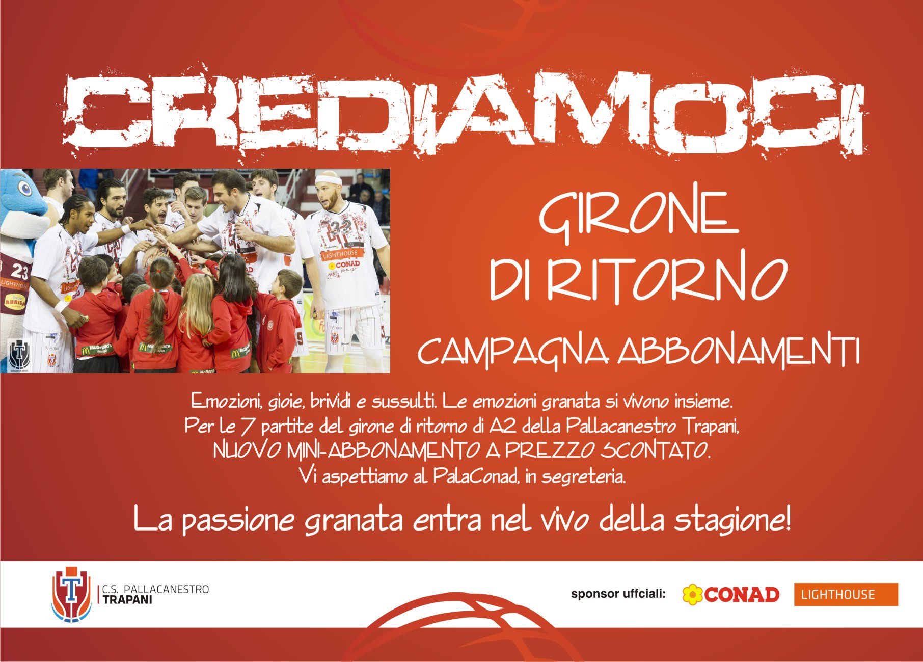 A partire da oggi, è ufficialmente attiva la campagna abbonamenti della Pallacanestro Trapani per il girone di ritorno del campionato in corso. Fino al prossimo 31 gennaio (giorno di Pallacanestro Trapani-Scafati) alle 12.30, infatti, presso i locali della biglietteria, sita all’interno del Pala Conad, sarà possibile sottoscrivere dei mini-abbonamenti validi per le rimanenti sette partite casalinghe che la nostra prima squadra giocherà nella stagione regolare di A2, girone Ovest, 2015/2016. L’unica tipologia di tessera disponibile per l’intero girone di ritorno è quella di “tribuna ordinaria”, al prezzo totale di 60 euro. Nella tutela dei tifosi che si sono legati alla Pallacanestro Trapani all’inizio della stagione, questa iniziativa nasce al fine di coinvolgere una fetta di appassionati sempre maggiore e di garantire alla squadra un sostegno ogni domenica crescente, addentrandoci nella seconda fase del campionato. Anche i nuovi abbonati, per la rimanente porzione della stagione godranno di uno sconto del 10% su tutti i prodotti del nostro T-store e sulle attività proposte dalla Pallacanestro Trapani.