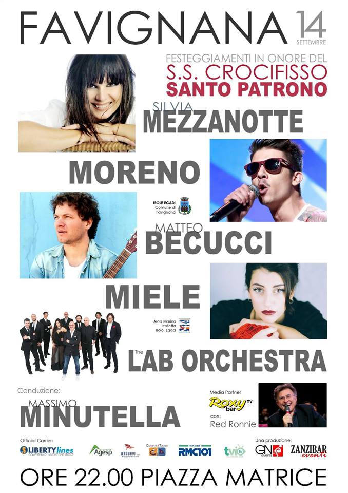 ´ iniziato il countdown a Favignana per la festa del Santo Patrono che si celebra il 14 settembre e che, come ogni anno, propone un programma ricco e corposo che si articola in più parti. Ad allietare il pubblico di residenti, dimoranti e turisti, per lo spettacolo serale alle ore 22, sarà un cast variegato composto da apprezzati talenti che l’Amministrazione Comunale ha scelto per una ricorrenza all’altezza delle aspettative del pubblico sempre numeroso e partecipe. Sul palco di piazza Matrice ci saranno Matteo Becucci, vincitore della 2° edizione di X Factor nel 2009, protagonista del Musical Jesus Christ Superstar, protagonista nel 2014 della 4° edizione di Tale e Quale Show; Moreno, semifinalista agli MTV Split nel 2012, premio della critica ad Amici 2013, protagonista nel 2015 della 65° edizione del Festival di Sanremo; Miele, giovane cantautrice siciliana D.O.C., protagonista di Area Sanremo e finalista di Sanremo Giovani nel 2016 con la bellissima “Mentre ti parlo” e, infine, Silvia Mezzanotte, dal 1999 al 2004 e ancora dal 2010 al 2016, voce solista dei Matia Bazar con i quali nel 2002 ha vinto il Festival di Sanremo con il brano “Brivido Caldo”. Nel 2016 si è aggiudicata la 6° edizione di Tale e Quale Show.