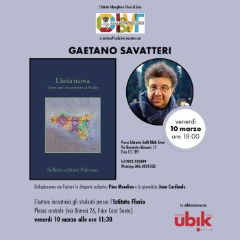 La Rassegna letteraria “Libriamoci - Incontro con l’Autore” dell’Istituto Superiore “I. e V. Florio” di Erice, in collaborazione con la Libreria Galli Ubik-Erice, ospiterà venerdì 10 marzo lo scrittore e giornalista Gaetano Savatteri che, con la tradizionale formula del doppio appuntamento, presenterà il suo nuovo lavoro dal titolo “L´isola nuova. Trent´anni di scritture di Sicilia”. L’autore incontrerà gli studenti, al Plesso centrale di via Barresi, alle ore 11.30, e nel pomeriggio, alle ore 18, i lettori e la cittadinanza, alla libreria Ubik in via Manzoni.