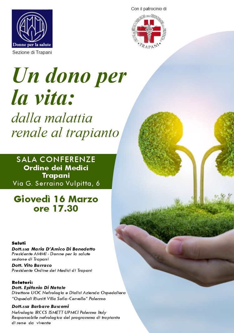 "Un dono per la vita: dalla Malattia Renale al Trapianto" è il tema della conferenza che si terrà giovedì prossimo 16 marzo, a partire dalle ore 17.30, presso la sede dell’Ordine dei Medici, in via Serraino Vulpitta a Trapani. L’evento è stato organizzato dall’associazione "AMMI Donne per la Salute", con il patrocinio dell’Ordine dei Medici.