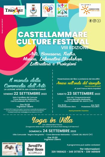 Ottava edizione per il “Castellammare Culture Festival": tre giorni dal 22 al 24 settembre, con momenti dedicati al teatro, alla lettura ed anche alla meditazione nel centro storico di Castellammare del Golfo, tra il corso Mattarella e la villa comunale Regina Margherita, nell’aula consiliare e nella sala del cinquecentenario.