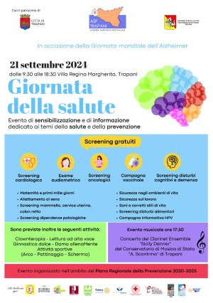 Nel corso della giornata sono previsti screening gratuiti, tra i quali quelli di tipo cognitivo, oncologico, cardiologico e audiologico, per i disturbi alimentari, le dipendenze patologiche etc. Inoltre, all´interno dei gazebi, sono previste le seguenti attività: • promozione dell´attività fisica e avvio dei gruppi di cammino; • sensibilizzazione sui corsi di accompagnamento alla nascita, sull´allattamento al seno e su altre tematiche relative alla maternità; • manovre per la vita; • sensibilizzazione sulla vaccinazione HPV e prenotazione delle vaccinazioni; • prenotazione di visite di screening; • informazione e comunicazione sulla donazione di organi e tessuti; • sicurezza sul lavoro con dimostrazione del corretto utilizzo dei DPI per prevenire gli incidenti sul lavoro; • informativa sui luoghi di lavoro che promuovono salute; • prevenzione degli incidenti domestici e stradali; • promozione della corretta alimentazione e della dieta mediterranea; • prevenzione dell´obesità; • principali fattori di rischio dei tumori modificabili attraverso un corretto stile di vita; • prevenzione della sordità tramite esami specifici; • prevenzione dell´ansia e della depressione. Sono, inoltre, previste le seguenti attività complementari a cura dei partner coinvolti: • Concerto di clarinetti a cura del Conservatorio "A.Scontrino" di Trapani (ore 17:30); • attività di fitness e fisico-posturali; • clownterapia; • attività sportive (tiro con l´arco, ginnastica, pattinaggio); • lettura ad alta voce; • dama allenaMente