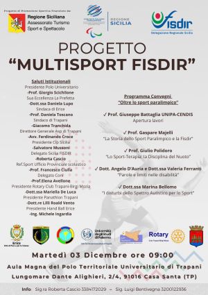 In occasione della Giornata internazionale dei diritti delle persone con disabilità, martedì 3 dicembre a partire dalle 9 nell’Aula Magna del Polo territoriale universitario di Trapani (lungomare Dante Alighieri, 2/4 Casa Santa – TP), si terrà il quarto e ultimo convegno di MultiSport Fisdir, progetto di promozione e diffusione della pratica sportiva, voluto da Fisdir Sicilia e finanziato dall’assessorato Turismo, Sport e Spettacolo della Regione Siciliana.