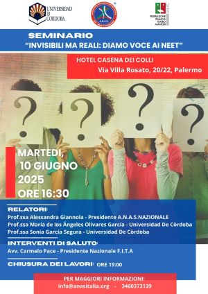 Martedì 10 giugno 2025, alle ore 16:30, presso l´Hotel Cesena dei Colli di Palermo (Via Villa Rosato, 20/22), si terrà un importante seminario dal titolo “Invisibili ma reali: diamo voce ai NEET”, promosso dall’Universidad de Córdoba, dall’A.N.A.S. (Associazione Nazionale di Azione Sociale) e dalla Federazione Italiana Teatro Amatori (F.I.T.A.). L’evento si propone di approfondire la condizione dei NEET , giovani spesso invisibili alle statistiche e trascurati dai percorsi di inclusione socio-lavorativa, ma la cui voce è fondamentale per costruire una società più equa e partecipativa. Durante il seminario interverranno: Prof.ssa Alessandra Giannola, Presidente A.N.A.S. Nazionale Prof.ssa María de los Ángeles Olivares García, Universidad de Córdoba Prof.ssa Sonia García Segura, Universidad de Córdoba