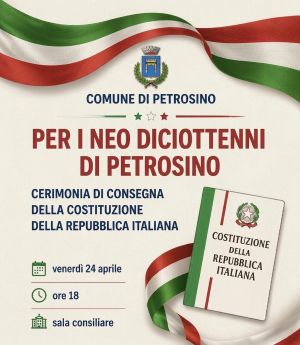 La cerimonia si svolgerà venerdì 24 aprile alle ore 18:00 presso l’Aula Consiliare del Comune di Petrosino e rappresenterà un momento di incontro e condivisione tra istituzioni e nuove generazioni. «Con questa iniziativa – sottolinea il Sindaco Giacomo Anastasi – vogliamo rivolgere ai nostri giovani un messaggio forte: essere cittadini significa partecipare, conoscere i propri diritti e adempiere con responsabilità ai propri doveri. La Costituzione è la guida che accompagna ciascuno di noi in questo percorso, a partire dall´Articolo 11 che ribadisce il ripudio della guerra e la promozione della pace e della giustizia tra le nazioni». L’Amministrazione invita tutti i neo diciottenni a partecipare a questo momento simbolico e formativo, pensato per valorizzare il loro ingresso nella vita civica del Paese.
