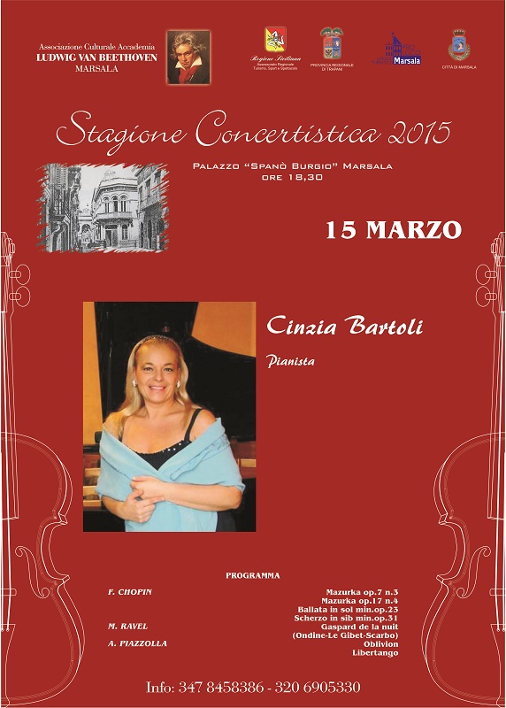 Domenica 15 marzo ore 18,30 presso il Palazzo Burgio/Spanò di Marsala, il recital della pianista Cinzia Bartoli per la XV Stagione Concertistica internazionale promossa dall´Accademia L. Van Beethoven con il patrocinio del comune di Marsala e dell´Assessorato Regionale Sport, Turismo e Spettacolo. Vincitrice del primo premio ai concorsi pianistici di Albenga e Stresa, Cinzia Bartoli si è perfezionata all´Ecole Normale de Musique Alfred Cortot di Parigi e si è esibita nei più prestigiosi teatri di tutto il mondo. In programma musiche di Chopin, Ravel, Piazzolla. Ingresso € 7