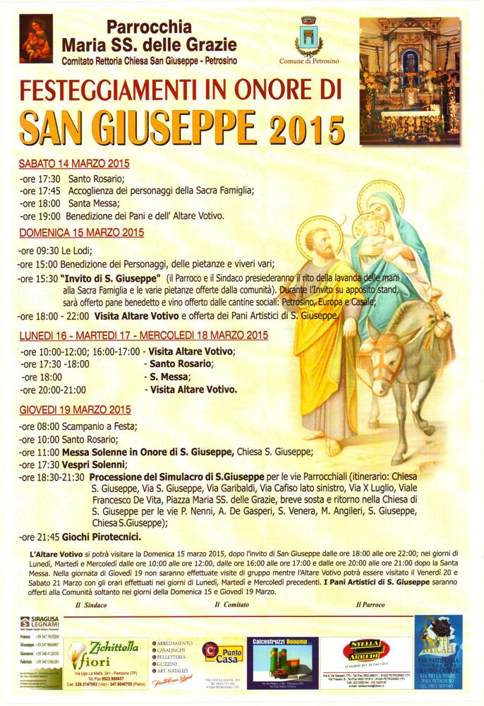 Ore 9:30 Le Lodi Ore 15:00 Benedizione dei personaggi, delle pietanze e viveri Ore 15:30 “Invito di San Giuseppe” ( Il Parroco e il Sindaco presiederanno il rito della lavanda delle mani alla Sacra Famiglia e le varie pietanze offerte dalla comunità). Durante l’Invito su apposito stand, sarà offerto pane benedetto e il vino delle cantine sociali: Petrosino, Europa e Casale Ore 18:00 – 22:00 Visita Altare Votivo e offerta dei pani Artistici di S. Giuseppe
