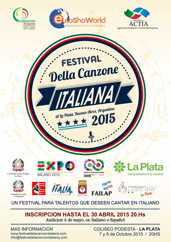 Il Corridoio Produttivo Turistico Culturale Italia Argentina (CPTCIA), è lieta di annunciare che il 7 e 8 ottobre 2015 la città di La Plata ospiterà la prima edizione del “Festival della Canzone Italiana”.