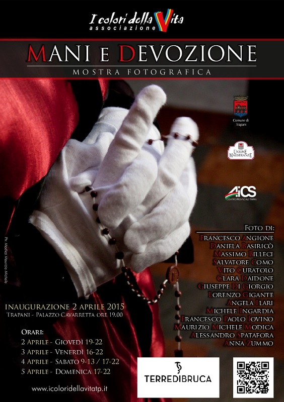 Dal 2 al 5 aprile 2015 – Palazzo Cavarretta, via Torrearsa - Trapani In occasione della Settimana Santa, l´Associazione “I Colori della Vita” di Trapani in collaborazione con il Comitato Provinciale AICS di Trapani organizza, una mostra fotografica collettiva dal tema “Mani e Devozione”. L’iniziativa nasce con l’intento di illustrare attraverso una serie di scatti gli atteggiamenti devozionali espressi anche dalla gestualità delle mani, sia nei loro aspetti privati ovvero di spiritualità vissuta nell’intimità, che in quelli corali come le processioni, nel corso delle quali il popolo, pur non dimenticandone il significato religioso, come atto di culto e come richiamo di penitenza, esprime nel contempo la ricchezza del suo costume e della sua cultura. L´esposizione, patrocinata dal Comune di Trapani e dall´Unione Maestranze di Trapani, sarà allestita nel centro storico, nell’androne di Palazzo Cavarretta di via Torrearsa e rimarrà aperta dal 2 al 5 aprile. Espongono: Francesco Angione, Daniela Basiricò, Massimo Billeci, Salvatore Como, Vito Curatolo, Clara Daidone, Lorenzo Gigante, Giuseppe di Giorgio, Angela Ilari, Michele Ingardia, Francesco Paolo Iovino, Maurizio Michele Modica, Alessandro Spatafora, Anna Zummo. L´inaugurazione è prevista per il 2 aprile alle ore 19,00. L´ ingresso è libero con i seguenti orari di apertura al pubblico: Giovedì 2 aprile – dalle 19:00 alle 22:00 Venerdì 3 aprile – dalle 16:00 alle 22:00 Sabato 4 aprile - dalle 9:00 alle 13:00 e dalle 17:00 alle 22:00 Domenica 5 aprile – dalle 17:00 alle 22:00