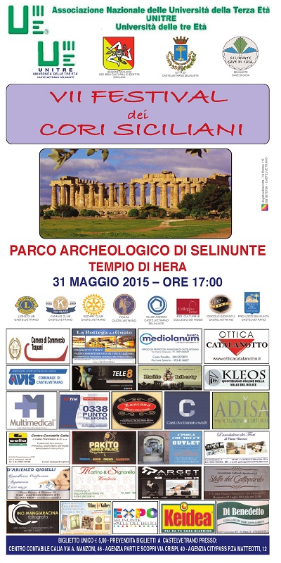 Ore 17:30: Saluti di indirizzo: Avv. Felice Errante, Sindaco della Città di Castelvetrano Selinunte Dott. Giovanni Barone Leto, Direttore Ente Parco Archeologico Selinunte Dott. Salvatore Stuppia, Assessore BB.CC. Città di Castelvetrano Ore 17:45: Esibizioni dei Cori di: NOTO, CANICATTÌ, AUGUSTA, PACHINO Ore 19:00: ”L’incontro tra Ettore ed Andromaca” - VI libro ILIADE, recital degli alunni del Liceo Classico “Giovanni Pantaleo” di Castelvetrano. Ore 19:15: Performance musicale del gruppo “LI JORNA DI LI SDIRRI“ Ore 19:40: Esibizioni dei Cori di: MODICA, CATANIA, BAGHERIA, CASTELVETRANO SELINUNTE Ore 21:30: Consegna alle Autorità ed ai Presidenti dei Cori di pergamene ricordo e cadeau offerti da Silvio Piazza, Amm.re Delegato dell’Azienda ”LA BOTTEGA DEL GUSTO” e dalla Dott.ssa Rosalba Costa e Saverio Perrone, Operatori Finanziari “BANCA MEDIOLANUM” Castelvetrano. Ore 22:00: CHIUSURA DEL FESTIVAL CONCLUDERANNO: il Presidente Nazionale dell’UNITRE, Prof. Gustavo Cuccini il Presidente dell’Unitre Castelvetrano Selinunte, Preside Prof. A. Ferri
