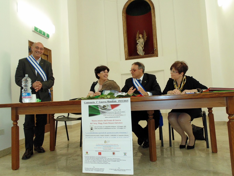 CAMPOBELLO DI MAZARA, 30/05/2015 Sino a domani (domenica 31 maggio), nell’ex chiesa Addolorata, sarà possibile visitare la mostra epistolare promossa dalla sezione di San Cipirrello dell’Associazione Nazionale Combattenti e Reduci di Guerra in occasione del Primo Centenario della Prima Guerra Mondiale. L’esposizione dal titolo “… E ci divideremo i pericoli di questa terra di crisantemi – Lettere dal Fronte” è stata allestita giovedì scorso con il patrocinio del Comune di Campobello. Le missive messe a disposizione dalle famiglie Daniela e Giovanni Gerardi e Rosamaria Lombardo di Campobello di Mazara fanno parte di un consistente numero di epistole scritte durante la Guerra dal loro prozio Salvatore Denaro, Serg. Magg. della 335esima Compagnia mitragliatrice Fante, caduto il 29 maggio 1917, all’età di soli 29 anni. All’inaugurazione della mostra che si è svolta giovedì scorso hanno preso parte il sindaco Giuseppe Castiglione e il vicesindaco Antonella Moceri. La mostra sarà aperta al pubblico anche stamattina (sabato 30 maggio) dalle ore 9 alle 13.