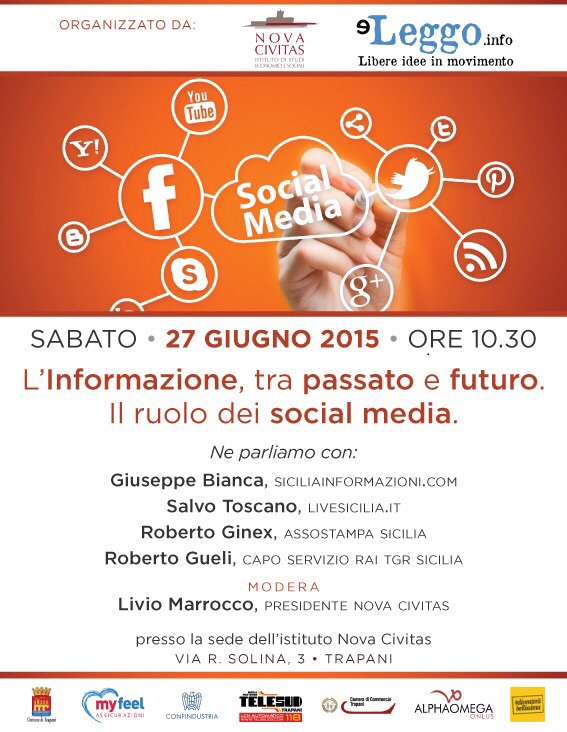 Si terrà sabato alle 10.30, in occasione dell´inaugurazione della nuova sede, in Via R. Solina 3 a Trapani l´incontro organizzato dall´Istituto Nova Civitas sul tema assai attuale dell´influenza dei social media sull´informazione. Parteciperanno Giuseppe Bianca di Siciliainformazione.com, Salvo Toscano di Livesicilia.it, Roberto Ginex Presidente Regionale di Assostampa e Roberto Gueli capo servizio TGR Sicilia RAI. L´incontro sarà moderato dal Presidente dell´Istituto On. Livio Marrocco. Ad interagire con i relatori anche molti giornalisti locali.