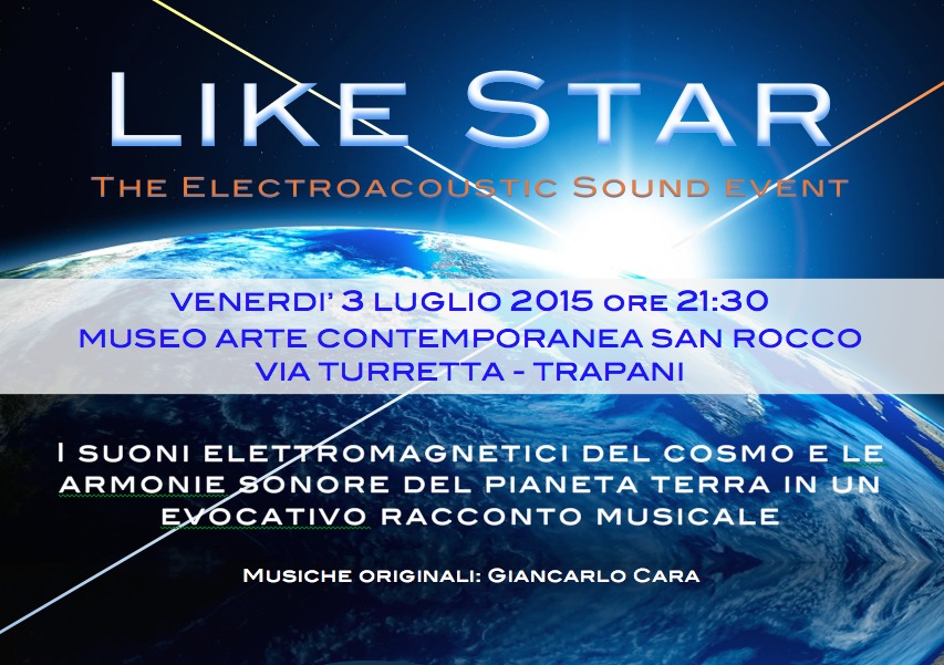 Venerdì prossimo, 3 luglio 2015, alle ore 21.30, ci aspetta un suggestivo momento di sperimentazione: un racconto musicale che intreccia le voci elettromagnetiche del cosmo con quelle del nostro pianeta, in una performance, LIKE STAR, composta ed eseguita agli strumenti elettroacustici da Giancarlo Cara accompagnato dal violoncello di Enzo Toscano, dai violini di Federico Caleca e Dario Amoroso.... Le musiche saranno danzate da Mariagrazia Virgilio e Debora Vultaggio su coreografie di Vitalba Cutrona.... LIKE STAR è un evento di musica elettroacustica che ha origine nei suoni "non udibili" a orecchio nudo del cosmo, in particolare del sole e del pianeta terra. Giancarlo Cara, a compimento di una ricerca alle scientifica che lo ha portato alla laurea in Musica Elettronica e Nuove Tecnologie ha captato e impiegato in composizioni musicali questi suoni che venerdì sera, al museo d´arte contemporanea S. Rocco, in Via Turretta a TP sarà possibile ascoltare in una serie di evocative melodie di origine elettromagnetica. Fra gli strumenti elettronici sarà di scena il Theremin.