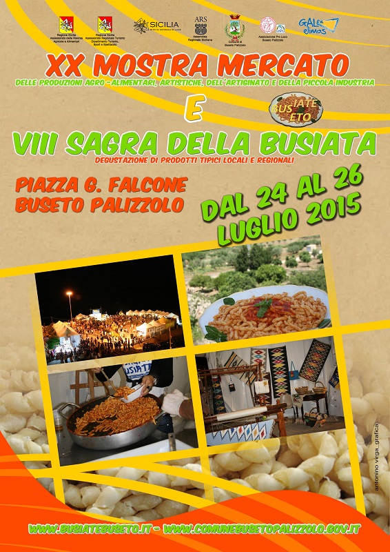“BUSIATE BUSETO” dal 24 al 26 Luglio 2015 Tradizionale appuntamento enogastronomico e culturale con la “XX MOSTRA MERCATO” e la “VIII SAGRA della BUSIATA” a Buseto Palizzolo (TP) Si rinnova l’appuntamento anche quest’anno a Buseto Palizzolo: per tre serate sarà la «Busiata» la grande protagonista di una entusiasmate Sagra, giunta alla sua VIII edizione. Si svolgerà nel contesto della XX Mostra Mercato, nella splendida piazza “G. Falcone”, naturale agorà per le occasioni di festa nel centro storico di Buseto Palizzolo, piccolo Comune del Trapanese, immerso nelle campagne tra Erice e Segesta, a pochi km da Trapani e le isole Egadi, Erice e S. Vito Lo Capo. Questo evento è una vetrina dei sapori, delle tradizioni locali e volano per una valorizzazione della cultura di origini rurali, ricca di valori, ritualità e tradizioni, che rivivono attraverso la Mostra Mercato dell´artigianato, delle produzioni artistiche, agroalimentari, della gastronomia e della piccola industria, in cui saranno presenti numerosi espositori, provenienti da diverse località, che daranno vita alla riscoperta dei mestieri e delle arti di una volta, con la manualità di abili artigiani, scultori, inventori, creatori, hobbisti, ecc. Inoltre, intrattenimento musicale, torneo di Burraco, karaoke e giochi gonfiabili per bambini con l´Isola dei Pirati Park. “La Sagra della Busiata” è un festival del gusto, con laboratori, dimostrazioni pratiche e degustazioni di questa tipica pasta locale, un tempo realizzata manualmente dalle massaie che in questa occasione si può gustare condita con i più svariati sughi tipici della tradizione locale. L’evento è organizzato dal Comune di Buseto Palizzolo in collaborazione con la Regione Siciliana-Assessorato Risorse Alimentari e Agricole - Assessorato del Turismo, dello Sport e dello Spettacolo - ARS - Associazione Pro Loco Buseto Palizzolo – G.A.L. Elimos.