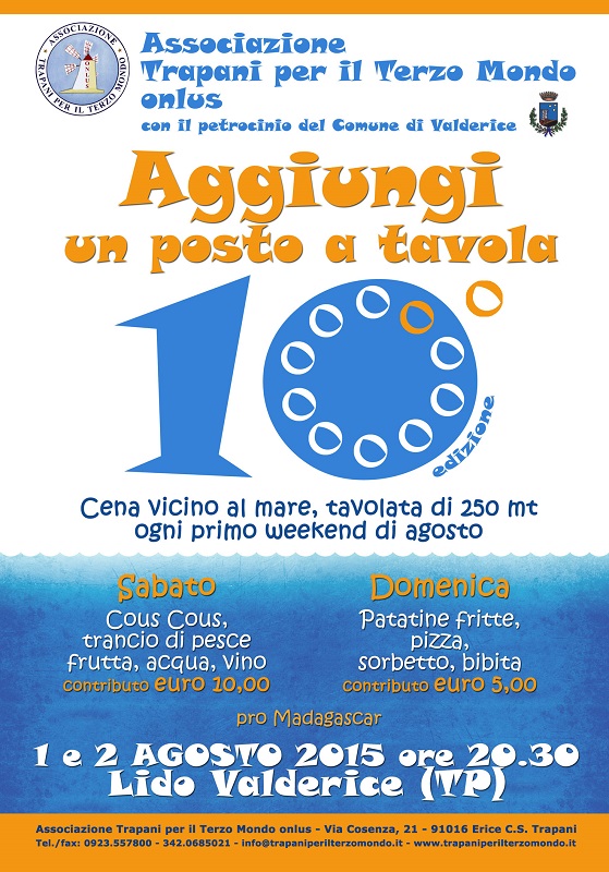 L’1 e il 2 agosto alle ore 20.30, si svolgerà a Lido Valderice (TP) la decima edizione di “AGGIUNGI UN POSTO A TAVOLA”. La manifestazione è organizzata dall’Associazione Trapani per il Terzo Mondo onlus e si svolge ogni primo weekend di agosto sul lungomare di Lido Valderice. L’iniziativa è una delle tante idee originali che l’Associazione mette in pratica per raccogliere fondi in favore del Madagascar, territorio sul quale opera da 16 anni ed ove ha costruito scuole, pozzi d’acqua, un blocco operatorio, e territorio che aiuta a livello sociale, scolastico ed economico anche tramite l’invio di container e tramite il sostegno delle adozioni a distanza. La manifestazione prevede due gustose cene “self service”. Sabato 1 agosto si cenerà con cous cous, trancio di pesce alla griglia, frutta, acqua e vino con un contributo di euro 10,00; domenica 2 agosto la cena prevede invece patatine, pizza, bibita, sorbetto, con un contributo di 5,00 euro. Una volta ritirata la cena, i convenuti potranno accomodarsi lungo la tavolata di 250 mt che viene allestita sul lungomare del Lido, tra piante, fiori e luci colorate. Un momento suggestivo dunque, allegro, ma anche romantico e sicuramente di solidarietà. I biglietti possono essere ritirati presso la sede dell’Associazione in Via Cosenza n° 21 a Erice Casa Santa oppure direttamente sul posto. Chi arriverà alla cena munito già di biglietto, però, avrà la precedenza su coloro i quali devono ancora acquistarlo. Per qualsiasi ulteriore informazione si può contattare l’Associazione tramite facebook, il sito web www.trapaniperilterzomondo.it o chiamando venerdì mattina allo 0923.557800.
