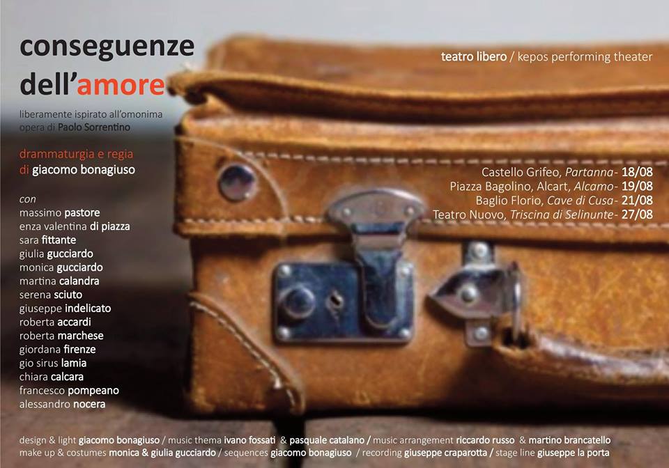 CAMPOBELLO DI MAZARA, 19/08/2015 Venerdì 21 agosto, alle ore 21.30, al Baglio Florio-Cave di Cusa, sulla provinciale che collega Campobello di Mazara alle frazioni di Tre Fontane e Torretta Granitola, andrà in scena “Le conseguenze dell’amore”, musical di Giacomo Bonagiuso liberamente tratto dall’omonima opera di Paolo Sorrentino con le musiche di Pasquale Catalano e Ivano Fossati. Il protagonista dell’opera è Titta Di Girolamo, un solitario di mezza età che ha trascorso gli ultimi anni di vita in un hotel di categoria superiore a Lugano, in Svizzera. Un ragioniere, un uomo di abitudine, senza immaginazione e senza frivolezza che ogni giorno si mette in moto e vaga, evitando il contatto con la gente. Un personaggio misterioso dunque che, visto dall´esterno, potrebbe addirittura sembrare affascinante, e che ha un segreto inconfessabile: ricicla il denaro di Cosa Nostra presso banche svizzere. Improvvisamente però la sua vita cambia. Un giorno infatti “si accorge” di Sofia, una cameriera che ha lavorato nello stesso hotel da due anni... una taglia in più e il buio: "mai sottovalutare le conseguenze dell´amore". Il leitmotiv della regia teatrale è dunque l’amore, analizzato da diversi punti di vista: ogni personaggio vive infatti la sua “conseguenza” in un modo intimo e personale. In scena: Massimo Pastore, Enza Valentina Di Piazza, Sara Fittante, Giuseppe Indelicato, Roberta Accardi, Serena Sciuto, Chiara Calcara, Giò Sirius Lamia, Giulia e Monica Gucciardo, Giordana Firenze, Alessandro Nocera, Martina Calandra, Roberta Marchese e Francesco Pompeano. Lo spettacolo è promosso dall’associazione Teatro Libero di Castelvetrano con il patrocinio del Comune di Campobello nell’ambito del palinsesto “E… state con noi 2015” varato dall’Amministrazione del sindaco Castiglione. Ingresso libero.