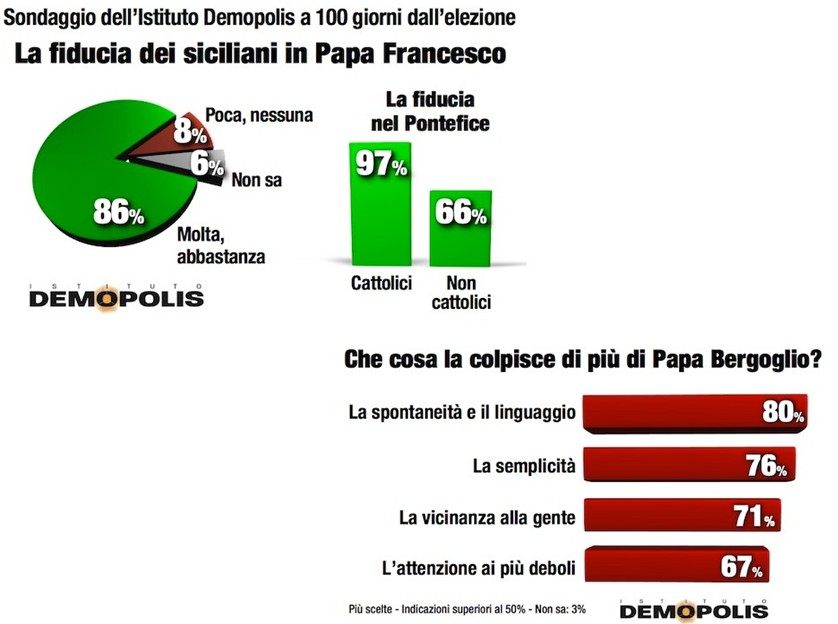 Papa Bergoglio, a 100 giorni dall’elezione al soglio pontificio, conquista anche la fiducia dell’86% dei siciliani: è uno dei dati più significativi che emerge dall’indagine condotta dall’Istituto Demopolis.
