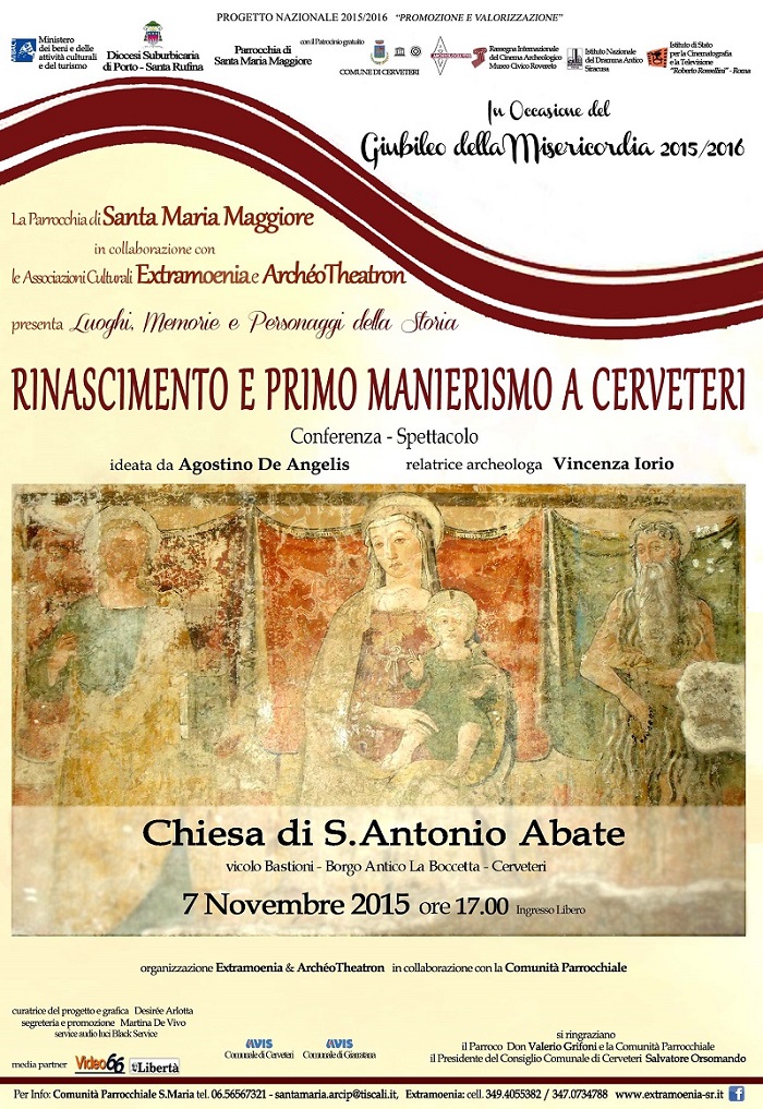 Sabato 7 Novembre alle 17 la Chiesa di S. Antonio Abate a Cerveteri accoglierà un interessante evento ideato dal regista Agostino De Angelis e tenuto dalla relatrice archeologa Vincenza Iorio ovvero la Conferenza-Spettacolo “Rinascimento e Primo Manierismo a Cerveteri”. L’appuntamento culturale, che rientra nel programma “Luoghi, Memorie e Personaggi della Storia” lanciato dall’ Associazione Culturale Extramoenia in collaborazione con la Chiesa Santa Maria in occasione del Giubileo della Misericordia 2015/2016, succede la rappresentazione teatrale multimediale “S.Francesco - Santa Chiara e la Regula Francescana” che il 4 Ottobre ha aperto con successo il calendario di eventi. “Rinascimento e Primo Manierismo a Cerveteri” si rivelerà appassionante excursus storico-artistico sui fervori culturali che coinvolsero proprio la città di Cerveteri all’indomani dell’elezione di Martino V Colonna nel 1417 e quindi alla fine del Periodo Avignonese; narrando poi dell’arrivo di alcuni grandi maestri dalla Toscana, dall’Umbria, dalle Marche e della formazione di quella “Scuola Romana” che determinò prima la nascita del movimento culturale noto come “Rinascimento Romano”, dopo, cioè agli inizi del secolo successivo, il XVI, della presenza a Cerveteri dei grandi protagonisti della pittura italiana ed europea tra la fine del Rinascimento e l’inizio del Manierismo. Un momento culturale alto che vuole guardare alle nostre pregevoli radici per conoscerle e farne tesoro. Il programma, promosso dalla Diocesi Suburbicaria di Porto-Santa Rufina e dalla Parrocchia di Santa Maria a Cerveteri nella persona di Don Valerio Grifoni con la collaborazione del Presidente del Consiglio Comunale di Cerveteri Salvatore Orsomando, si svolgerà parallelamente all’altrettanto nutrito programma della Chiesa alla Badia di Sant’Agata a Catania . Ingresso libero.