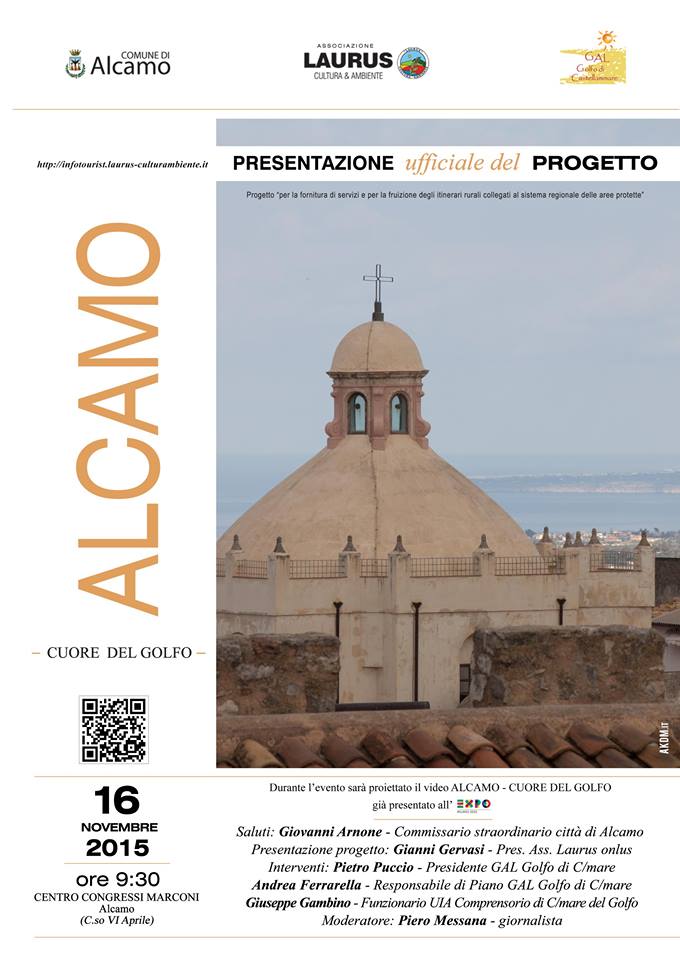 Sarà presentato domattina, lunedì 16 novembre alle ore 9.30, ad Alcamo presso il centro congressi “Marconi” di corso 6 Aprile, l´innovativo progetto dell´associazione "Laurus – Cultura e Ambiente" che prevede una vasta offerta di servizi e che è stato denominato "ALCAMO CUORE DEL GOLFO". L´iniziativa, finanziata dal "GAL Golfo di Castellammare", è imperniata su tre splendidi itinerari, naturalistici e culturali, da effettuarsi "esclusivamente" senza mezzi motorizzati: la "mobilità eco-sostenibile" è la caratteristica principale. Tutti a piedi o in bici a scoprire le bellezze del territorio. I lavori saranno aperti, domattina, da un minuto di silenzio per le vittime di Parigi. Seguiranno i saluti delle istituzioni: il commissario straordinario del comune di Alcamo, Giovanni Arnone e il presidente del consiglio comunale, Giuseppe Scibilia. Con la proiezione del video "Alcamo Cuore del Golfo", edito da ZepStudio di Milano, si entrerà nel vivo del progetto che sarà illustrato dal suo ideatore Gianni Gervasi, presidente della “Laurus”. I lavori continueranno poi con gli interventi del presidente e del responsabile di piano del “Gal Golfo di Castellammare”, Pietro Puccio e Andrea Ferrarella. In chiusura interverrà Giuseppe Gambino, funziionario dell’UIA di Castellammare del Golfo. Alcamo, 15 novembre 2015