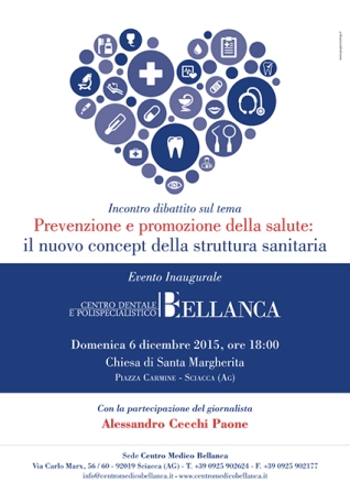 “Prevenzione e promozione della salute: il nuovo concept della struttura sanitaria”. È questo il titolo dell’incontro dibattito in programma domenica 6 dicembre alle ore 18 nella Chiesa di Santa Margherita di Piazza Carmine a Sciacca. L’evento vedrà la partecipazione delle autorità locali e dei medici specialisti del Centro Medico Bellanca, promotore dell’iniziativa. Inoltre, interverrà in qualità di relatore il noto giornalista e conduttore televisivo Alessandro Cecchi Paone, da sempre attento alle tematiche legate al mondo della scienza e della medicina. A seguire, ci sarà l’inaugurazione del Centro Medico Bellanca, nuovo polo sanitario sito in via Carlo Marx a Sciacca nato da un’idea di Giuseppe Bellanca, con oltre 30 anni di esperienza nel settore odontoiatrico. Il Centro raccoglierà, in un ambiente totalmente nuovo, una clinica dentale e pedodontica e studi medici in cui si alterneranno professionisti in grado di eseguire visite specialistiche e attività diagnostiche. La nuova struttura, grazie agli elevati standard qualitativi offerti in ambito sanitario e alle strumentazioni all’avanguardia, si pone l’obiettivo di diventare in poco tempo un punto di riferimento per tutti i siciliani.