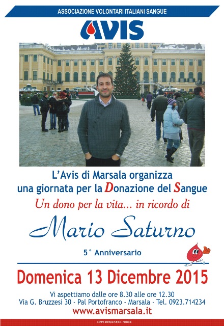 Domenica prossima, 13 dicembre, l´Avis di Marsala dedicherà la giornata di donazione a Mario Saturno, di cui ricorre il 5° anniversario dalla prematura scomparsa. La famiglia Saturno e il presidente Isabella Galfano invitano amici, conoscenti, semplici cittadini ad un gesto di solidarietà verso il prossimo - valore in cui credeva Mario, donatore anche lui - ed essere numerosi per la giornata in ricordo dello sfortunato giovane avvocato. È possibile effettuare la donazione dalle ore 8 alle 12.30. Intanto, l´Avis comunica che nel corrente mese di dicembre – tenuto conto del periodo natalizio – le prossime raccolte di sangue si alterneranno tra le giornate di venerdì (11 e 18) e domenica (13 e 20). L´ultima donazione del 2015 è programmata per martedì 29 dicembre.