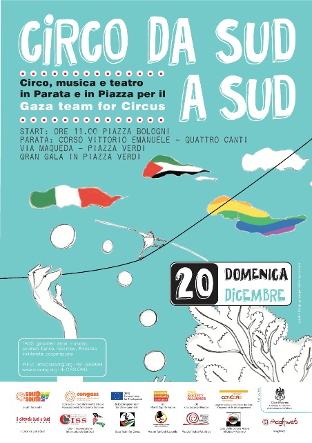 A Gaza nel 2011 un gruppo di giovani provenienti da varie zone della Striscia e animatori di piccole associazioni che utilizzano l’arte circense come strumento per supportare i bambini decide di condividere un grande sogno: aprire una scuola di circo sociale a Gaza. Un esperimento unico nella Striscia, portato avanti con tutte le difficoltà (a volte enormi) del luogo in cui vivono ma con una tenacia incredibile: formandosi anche da soli, guardando spettacoli e sperimentando tecniche che trovano su YouTube, cadendo, rialzandosi, trovando alternative per costruire da soli gli attrezzi e gli strumenti di giocoleria che non si trovano nella Striscia di Gaza e allenandosi. Il CISS ha sostenuto e sta sostenendo le loro attività e durante il viaggio ha incontrato altri amici che vogliono sostenerli: artisti e operatori palermitani e siciliani che valorizzano l´arte circense e la cultura come agenti di trasformazione sociale e strumenti pedagogici di valore, artisti di teatro, danza, operatori della comunicazione, associazioni e organizzazioni di solidarietà internazionale. Da questo magnifico incontro nasce CIRCO DA SUD A SUD: un evento ma anche un progetto che vedrà DOMENICA 20 DICEMBRE SCENDERE TUTTI IN STRADA IN UNA COLORATA E MAGICA PARATA CHE SI CONCLUDERà CON UN GRAN GALA IN PIAZZA VERDI. I sogni hanno bisogno di una casa. Costruiamo la prima scuola di circo di Gaza. DOMENICA 20 DICEMBRE, NON PUOI MANCARE! Se sei un´artista e ti va di partecipare scrivici: p.decandia@cissong.org
