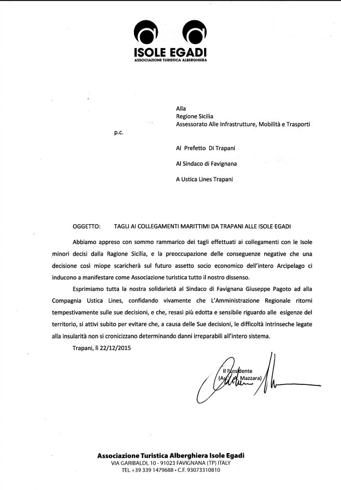 L´Associazione Turistica Alberghiera delle Isole Egadi, presieduta da Antonino Mazzara, ha inviato una nota alla Regione Siciliana, al sindaco Giuseppe Pagoto e alla Ustica Lines, in cui esprime solidarieta´ allo stesso sindaco e alla Compagnia di navigazione e in cui contesta la decisione della Regione di effettuare un taglio ai collegamenti marittimi con le Isole, auspicando un passo indietro su tale provvedimento da parte dell´Amministrazione regionale affinche´ il territorio, i suoi cittadini e tutte le attivita´ non vengano penalizzati in modo ingiusto. In allegato la nota prodotta.