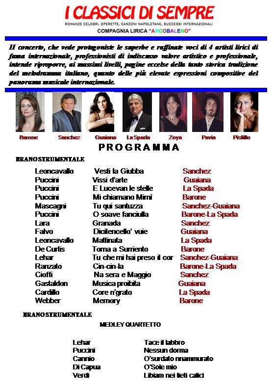E´ iniziato il conto alla rovescia per l´atteso appuntamento con "I classici di sempre": una serata elegante, dedicata alla musica per intenditori, che propone un concerto eseguito da interpreti di fama internazionale. Si svolgerà domenica 10 gennaio alle ore 18 al Teatro Comunale "Eliodoro Sollima" e protagoniste ne saranno le superbe e raffinate voci di 4 artisti lirici, noti professionisti di indiscusso valore, che riproporranno, ai massimi livelli, pagine eccelse della storica tradizione del melodramma italiano quanto delle più elevate espressioni compositive del panorama musicale internazionale. L’appuntamento inaugurerà il nuovo anno all’insegna della cultura e del talento, con romanze celebri, operette, canzoni napoletane e classici internazionali, e vedrà esibirsi sul palco, tra gli altri, l’apprezzato Tenore Miguel Sanchez – Moreno. In programma capolavori di Puccini, Leoncavallo, Mascagni, De Curtis e Lehar. Gli artisti protagonisti, oltre a Miguel Sanchez-Moreno, saranno: Simona Guaiana (Soprano), Francesco La Spada (Tenore), Carmen Barone (Soprano), Zoya Nademlynska (Violino) e Leonardo Pavia (Pianoforte). Lo spettacolo, la cui direzione artistica è a cura di Ugo Esposito, è della Compagnia Lirica "ARCOBALENO". Presenterà la serata Elena Pistillo. La prevendita dei biglietti viene effettuata da DNT Service di via Sibilla, 12 a Marsala (Tel. 0923719545) Il coordinamento organizzativo è di Adriano Salerno.