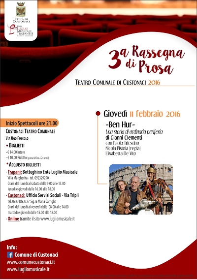 Ben Hur Una storia di ordinaria periferia Giovedì 11 febbraio 2016 Ore 21.00 TEATRO COMUNALE DI CUSTONACI (Via Ugo Foscolo – Custonaci) Custonaci, 3 febbraio 2016 - Apre in grande stile la Terza Rassegna di Prosa del Teatro Comunale di Custonaci, organizzata dal Comune di Custonaci con il supporto tecnico dell’Ente Luglio Musicale Trapanese –Teatro di Tradizione. Giovedì 11 febbraio, alle ore 21.00, al Teatro Comunale di Custonaci (in Via Ugo Foscolo) si inizia con “Ben Hur Una storia di ordinaria periferia”, uno spettacolo tra i più amati dal pubblico italiano negli ultimi anni, visto in quasi duecento città dello Stivale, osannato da numerosi critici. Una pièce teatrale scritta da Gianni Clementi con gli attori Nicola Pistoia (che firma anche la regia dello spettacolo), Elisabetta De Vivo, Paolo Triestino. Una commedia di grande semplicità e comicità brillante che offrirà un connubio di risate e momenti di profonda riflessione attraverso il tema dell’immigrazione. Sergio è un stuntman caduto in disgrazia e per sbarcare il lunario si arrangia a posare, vestito da centurione, per i turisti che passano davanti al Colosseo. Sua sorella Maria è separata, per arrotondare gli spiccioli del fratello è costretta a lavorare in una chat erotica. Irrompe nelle loro vite Milan, ingegnere bielorusso con tanta voglia di lavorare. Per mandar soldi alla sua famiglia, si arrangia a far tutto, anche a sostituire Sergio nel ruolo di centurione. Sarà possibile acquistare i biglietti (intero 14,00 euro, ridotto 10,00 euro giovani fino a 24 anni) online sul sito http://www.lugliomusicale.it/, al Botteghino dell’Ente Luglio Musicale Trapanese presso la Villa Comunale Regina Margherita a Trapani e presso gli Uffici Servizi Sociali del Comune di Custonaci, in Via Tripli. Per info: 0923 29290 / 0923 189237 - Pagina Facebook del Comune di Custonaci e sul sito http://www.comunecustonaci.it/.