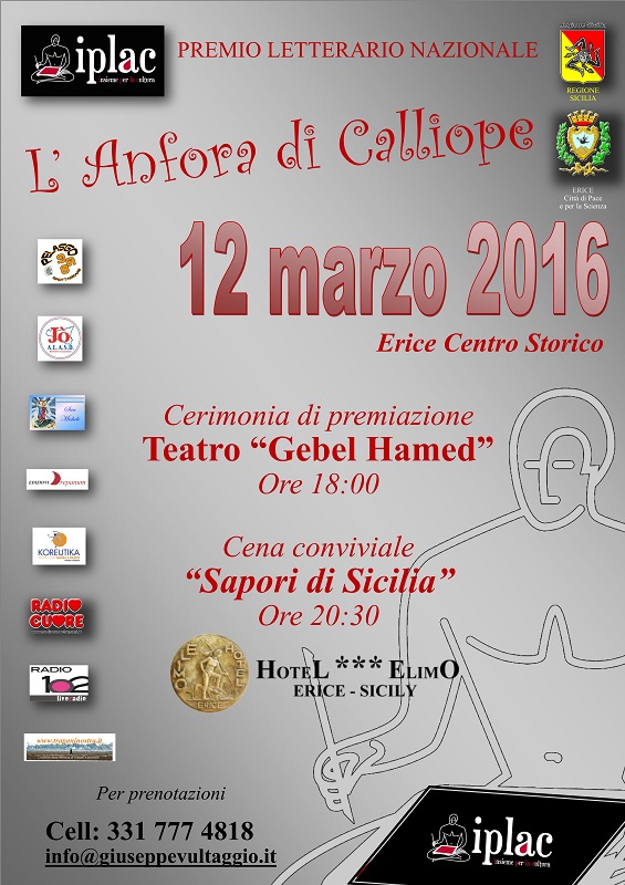 Domani, presso il Teatro “Gebel Hamed” di Erice a partire dalle ore 18:00, avrà luogo la cerimonia di premiazione del Concorso Letterario Nazionale “L’ANFORA DI CALLIOPE”, curata da Giuseppe Vultaggio direttore artistico dell’IPLAC e consigliere responsabile per la regione Sicilia. Una kermesse musico-letteraria organizzata dal Circolo IPLAC (Insieme per la cultura) di Grosseto con il patrocinio del Comune di Erice, in cui musiche e danza si mescoleranno a letture di poesie e di testi. Al concorso hanno partecipato oltre duecento autori rappresentanti di tutte le regioni del territorio nazionale e provenienti anche dalla Francia e da San Marino. La giuria, presieduta dalla Professoressa Caterina Guttadauro La Brasca (BO) e da altri nove giurati provenienti da diverse regioni d’Italia, ha decretato la classifica finale, che prevede l’assegnazione dei premi oltre che ai primi tre posti per ogni sezione, due premi speciali uno della giuria ed uno alla memoria. La parte musicale sarà curata dal M° Mario Genna che siederà al pianoforte e le voci saranno quelle di Nicoletta Bellotti e Piero Corso. Le coreografie sono state affidate alla coreografa Vitalba Cutrona del Koreutika di Trapani. Condurrà Giuseppe Vultaggio.