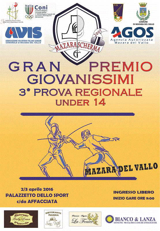 La Città di Mazara del Vallo ospiterà sabato 2 e domenica 3 Aprile al Palazzetto dello Sport di Contrada Affacciata, la 3^ ed ultima tappa del Gran Premio Giovanissimi Regionale di scherma. Un appuntamento molto sentito per tutto il movimento schermistico siciliano visto che verranno assegnati i Titoli di Campioni Regionali per la stagione sportiva 2015/2016 e soprattutto in vista del Gran Premio Giovanissimi Kinder + Sport che dal 27 aprile al 3 maggio prenderà il via a Riccione ed assegnerà i titoli italiani di categoria. A contendersi i titoli regionali saranno 24 categorie U14, per un totale di circa 300 giovani schermidori, provenienti da tutta la Sicilia. L’evento è organizzato dalla Mazara Scherma A.S.D. con il patrocinio della Città di Mazara del Vallo, le gare inizieranno sia sabato 2 che domenica 3 alle ore 9,00. Un appuntamento di assoluto rilievo, in vista dell’accordo di “City Partner” che la Federazione Italiana Scherma siglerà con la Città di Mazara del Vallo e frutto dell’incontro avuto tra il M° Giorgio Scarso, Presidente Nazionale della Federazione e il Sindaco, on Nicola Cristaldi. “Un appuntamento di grande interesse – ha detto l’Assessore allo Sport Vito Billardello – che conferma l’importanza di un movimento sportivo quale quello schermistico cha ha radici storiche nella nostra Città.”