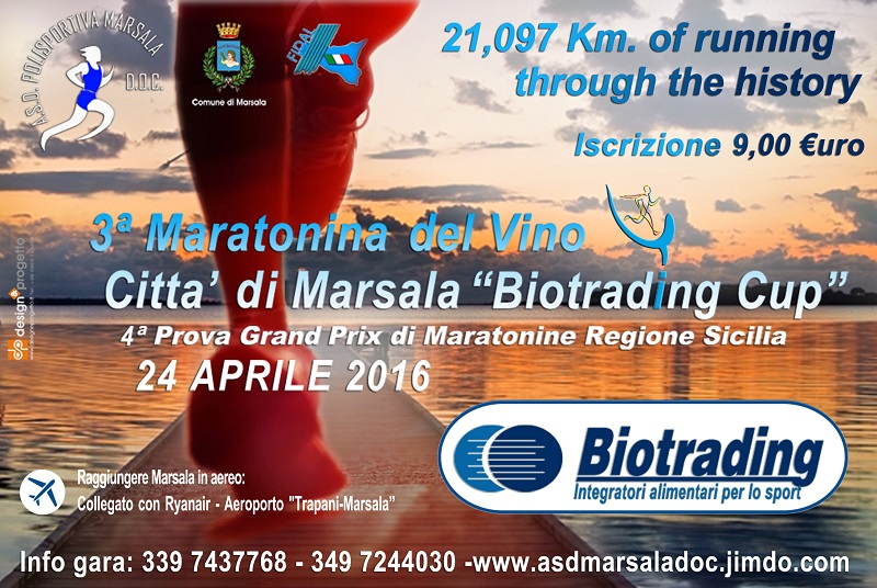 Domenica prossima, si corre a Marsala la 3^ edizione della "Maratonina del Vino". Organizzata dalla Polisportiva "Marsala Doc" presieduta da Filippo Struppa, l´appuntamento - prova ufficiale Gran Prix per la Sicilia - si avvale del patrocinio del Comune di Marsala. La presentazione dell´evento sportivo, cui presenzieranno il sindaco Alberto Di Girolamo e il dr. Maurizio Mannone (Biotrading, sponsor della manifestazione), avverrà giovedì prossimo - 21 aprile - a Palazzo Municipale, nella Sala Giunta (ore 10,30).