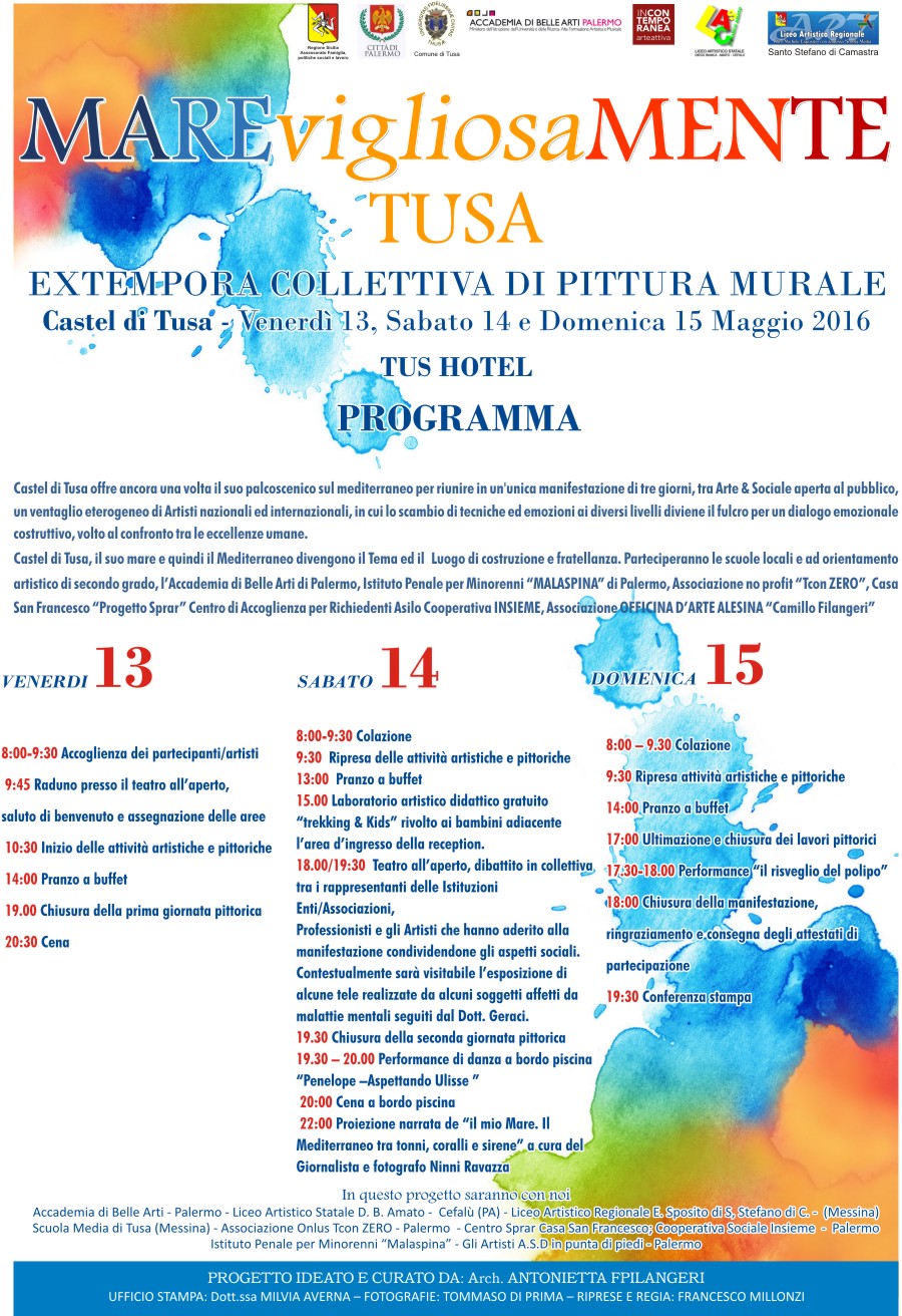 Estemporanea di pittura, aperta al pubblico, a Castel di Tusa dal 13 al 15 maggio «In un’epoca di chiusure, in cui sorgono nuovi muri per escludere le persone, vogliamo realizzarne uno che nasce dall´integrazione di pezzi di umanità diversa e stridente e che, da Tusa, in provincia di Messina, guardando il mare, mostri all´Europa il senso profondo della fratellanza». Spiega così l´artista palermitana Antonietta Filangeri, la sua Marevigliosamente Tus´A una collettiva di pittura che dal 13 al 15 maggio, a Castel di Tusa, ricoprirà di colore un muro bianco di ben 110 metri, lungo tutto il perimetro del Tus´Hotel, attraverso le opere di artisti giunti da tutto il mondo ma anche di amanti della pittura, turisti e visitatori, che potranno lasciare il proprio segno. Oltre ad artisti affermati e agli studenti dell´Accademia di Belle Arti di Palermo, per un significativo coinvolgimento territoriale, ci saranno i ragazzi dei licei artistici di Cefalù e di Santo Stefano di Camastra, e gli alunni della scuola media di Tusa che realizzeranno il bozzetto ideato dagli ospiti dell´istituto di pena per minori Malaspina di Palermo. E tra i volti della variegata umanità di Marevigliosamente Tus’A, anche giovani rifugiati e richiedenti asilo del Mali e del Gambia, del progetto Sprar a cui fa riferimento l’associazione Insieme Casa San Francesco di Palermo, e un piccolo gruppo di audiolesi dell’associazione onlus T-con Zero che fa terapia attraverso l’arte. «L’immigrato, il sordo, l’uomo che è caduto e che tenta di rialzarsi, ciascuno sarà una tessera dell´ideale mosaico fatto di umanità del murales Marevigliosamente Tus´A, espressione artistica dell’integrazione sociale in linea con il messaggio di Papa Francesco» sottolinea l´organizzatrice, che ha dedicato questo progetto alla città di Tusa e al padre Camillo Filangeri, architetto e docente universitario che, su questo territorio ha investito culturalmente, studiandone gli aspetti storici legati al patrimonio architettonico. Un’opera che vivrà per tutta l’estate e resterà per sempre Marevigliosamente Tus’A movimenterà la stagione di Castel di Tusa per tutta l’estate. Conclusa quest prima tappa, infatti, all´inizio giugno, il cuore del murales sarà affidato all´artista spagnola Leticia Mandragora che riporterà con i colori sul muro il sentiment della tre giorni. Sempre a giugno l´Accademia di Belle arti di Palermo, metterà in opera la sua realizzazione a rilievo, collocando i calchi delle mani di coloro che durante questo week end hanno voluto lasciare le loro impronte, su tavolette di argilla fresca. Il pot-pourri di mani sarà ricomposto dagli studenti secondo le direttive e le indicazioni artistiche del docente maestro Giacomo Rizzo. Il 29 ed il 30 luglio Togo, artista milanese con radici messinesi, lascerà il suo segno sul muro di Marevigliosamente Tus´A su nuove superfici. Tag: arte, Marevigliosamente Tus’A, Antonietta Filangeri, pittura, murales, Tusa, Papa Francesco, immigrazione Disascalie: 1_L´artista Antonietta Filangeri ideatrice di Marevigliosamente Tusa 2_Il muro che ospiterà Marevigliosamente Tusa 3_Panorama di Castel di Tusa dove sarà posizionato il murales Marevigliosamente Tusa