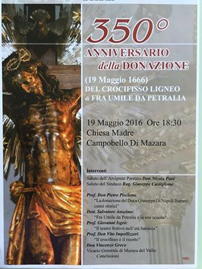 Comunicato Stampa n. 100 del 18/05/2016 Appuntamento storico-culturale per celebrare il 350esimo anniversario della Donazione del SS. Crocefisso, domani (19 maggio), alle ore 18.30, nella Chiesa Madre di Campobello di Mazara. Il convegno, promosso dall’arciprete don Nicola Patti con la collaborazione della Confraternita del SS. Crocefisso e con il patrocinio del Comune, si propone di celebrare l’evento della donazione, avvenuta nel 1666, della preziosa opera lignea di fra Umile Da Petralia da parte del duca di Giuseppe II di Napoli Barresi. Il 19 maggio del 1966 rappresenta, dunque, una data storica per Campobello di Mazara, la cui importanza si evince anche dal manoscritto conservato nell’archivio storico della Chiesa Madre, all’interno del quale, a margine di uno dei “liber mortuorum”, si fa riferimento proprio al dono del Crocifisso alla comunità campobellese. Ad aprire il convegno saranno il sindaco Giuseppe Castiglione e l’arciprete don Nicola Patti. Interverranno, inoltre, don Pietro Pisciotta, che relazionerà sugli aspetti storici dell’evento della donazione; il prof. Salvatore Anselmo, che tratterà invece degli aspetti artistici dell’opera attraverso una panoramica sulla produzione di fra Umile da Petralia e della sua “Scuola”; il prof. Giovanni Isgrò che relazionerà su “Il teatro festivo nell’età barocca”; il prof. don Vito Impellizzeri che svilupperà il tema “Il Crocifisso è il Risorto” e, infine, il vicario generale della Diocesi di Mazara, don Vincenzo Greco, al quale saranno affidate le conclusioni. Le celebrazioni in onore del SS. Crocefisso, iniziate domenica scorsa con l’apertura della Porta della Misericordia, si concluderanno lunedì prossimo (23 maggio), alle ore 19, in Chiesa Madre, dove, dopo la celebrazione eucaristica, si terrà un concerto di musica barocca eseguito da Laura Li Vigni (violino) e da Gabriele Di Pietra (liuto, arciliuto, tiorba e chitarra barocca).