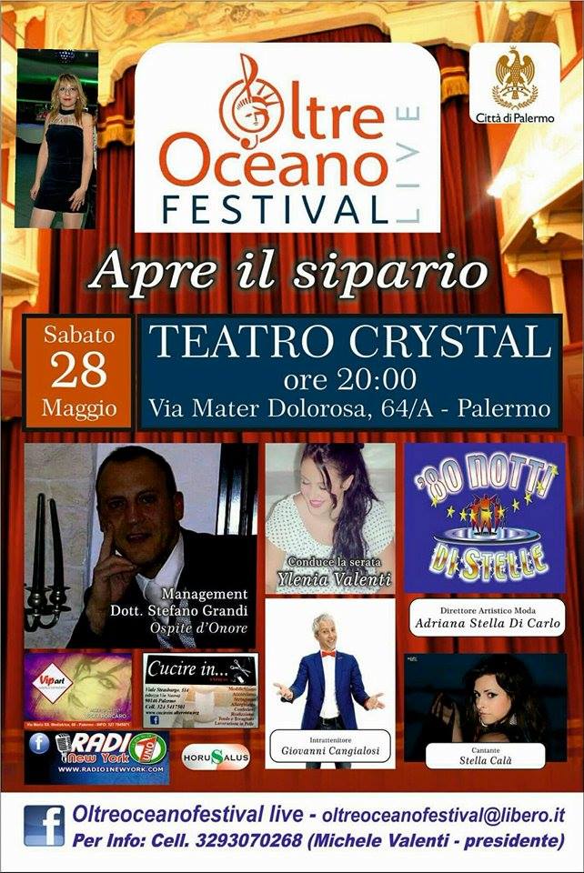 Una serata divertente ed elegante al tempo stesso quella organizzata da Oltreoceano Festival di Michele Valenti al teatro Crystal di Palermo alle ore 21 sabato 28 maggio. Uno spettacolo – vetrina per tanti talenti siciliani che si sono esibiti, ciascuno nella propria disciplina, moda, canto, ballo, dinanzi ad una giuria di esperti presieduta da Stefano Grandi, arrivato da Milano in Sicilia per partecipare alla manifestazione e scrutare i talenti partecipanti. Lui che di spettacolo se ne intende, lui che da produttore discografico di musica pop dance, ha creato “80 Note di stelle”, spettacolo itinerante che vanta più di 60 tappe nazionali e internazionali all’anno con conduttori del calibro di Marina Suma, Michele Cucuzza, Fabrizio Frizzi, Massimo Giletti e Eleonora Daniele. “Manifestazioni come quella organizzata da Valenti possono essere trampolini di lancio per chi cerca un posto nel mondo dello spettacolo – ha dichiarato il manager Stefano Grandi - perché molti giovani possono così dimostrare di avere le capacità e le carte in regola per fare della loro passione un mestiere”. Ed ecco e aspiranti modelli e attraenti modelle, truccate da Vicky Porcaro, e con gli abiti degli stilisti Giusy Crivello e Stefano Pullara, hanno sfilato su un palcoscenico, consapevoli che l’occhio critico ed esperto di Grandi le stava osservando, così come le giovani promesse del canto e del ballo. La serata, con la conduzione di Ylenia Valenti e la direzione artistica di Adriana Stella Di Carlo, è stata animata dal cabarettista Giovanni Cangialosi. Ospiti della serata le cantanti Stella Calà, Maria Pia Molinaro e Noemi Dragotta. Dopo l’incoronazione di Miss e Mr Crystal, ad alzare in cielo il grande trofeo messo a disposizione dall’organizzazione, sono stati gli allievi della scuola di ballo “Asd School of dance”che, con la loro performance e la loro coreografia, hanno convinto la giuria.