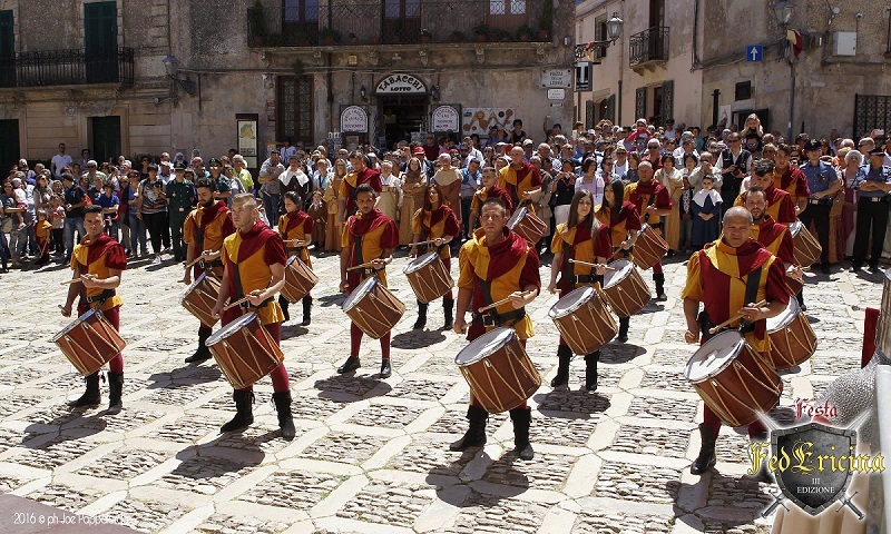 Forte e maestoso poi è risuonato in ogni angolo della città il suono dei “Tamburi di Buccheri”, ancora una volta la loro esibizione per le stradine di Erice ha riscosso grande attenzione da parte di turisti e visitatori. Il suono all’unisono dei tamburi ha impressionato notevolmente, coinvolgendo quanti si trovavano per strada ad unirsi alla festa. Di sfilata in sfilata poi con gli sbandieratori Agro-Priolesi.