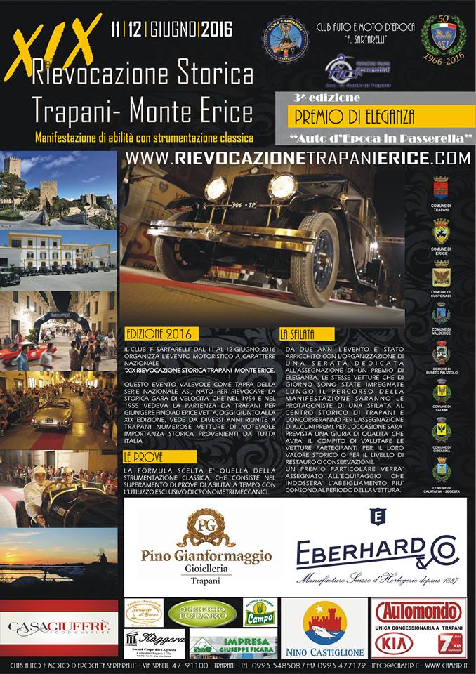 domani, giovedì 9 giugno alle ore 10.30, presso l´atrio di Palazzo Cavarretta, a Trapani, avrà luogo una conferenza stampa indetta dal Club che, inoltre, esporrà anche delle autovetture, una Alfa Romeo 1900, stesso modello che porto alla vittoria Pasquale Tacci alla prima Edizione della Monte Erice svoltasi nel 1954 e una Jaguar E type esempio di perfetto restauro di un´auto d´epoca. Sarà presentata la manifestazione turistico-culturale di auto d´epoca denominata XIX Rievocazione storica Trapani-Monte Erice, tappa della serie nazionale Asi che si svolgerà questo weekend (11-12 giugno) e che è organizzata dal Club. Interverranno il presidente del Club, Salvatore Mustazza, il coordinatore dell´evento e direttore di gara Carlo Incammisa, il commissario manifestazione e pubbliche relazioni Alberto Catalano, il commissario tecnico club Salvy Marino, il tesoriere Antonio Trapani, il segretario Gianni Doria e il consigliere commissione tecnica imbarcazioni a motore Giampiero Musmeci. Ci sarà anche Vittorio Sartarelli, figlio di Francesco, cui è dedicato il nostro Club. Nel corso della conferenza stampa saranno illustrati i dettagli della manifestazione, della quale si allega locandina.