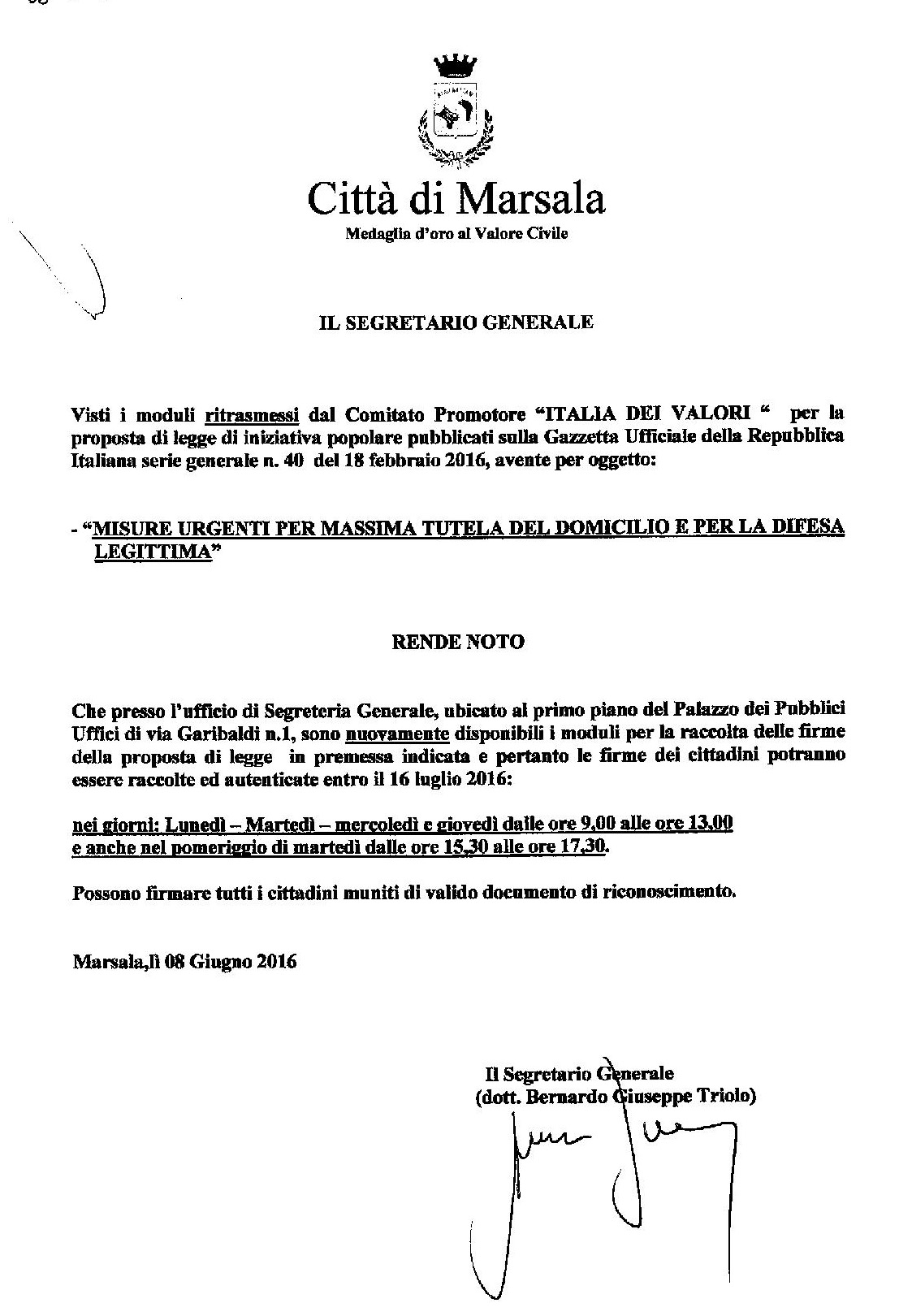 La Segreteria Generale, diretta dal dr. Bernardo Triolo, rende noto che presso i propri Uffici - ubicati al primo piano del Palazzo Municipale (via Garibaldi 1) - sono disponibili i moduli per la sottoscrizione della proposta di "REFERENDUM COSTITUZIONALE" avente come quesito l´approvazione della nuova Legge Costituzionale, i cui contenuti sono riportati nell´Avviso qui allegato. Il servizio di raccolta e autenticazione firme è assicurato - fino alla scadenza del prossimo 27 giugno - nelle seguenti giornate: - da lunedì a giovedì, ore 9/13; - martedì anche nel pomeriggio (15,30/17,30) I cittadini dovranno esibire valido documento di riconoscimento.