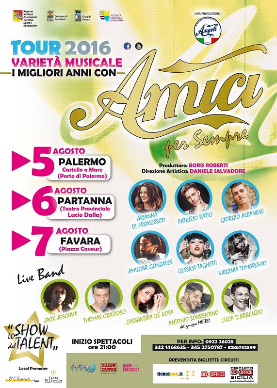 Il Comune di Partanna, nell’ambito della rassegna Artemusicultura 2016 in fase di programmazione, ospiterà una delle tre date del tour siciliano del talent televisivo più seguito “AMICI di Maria De Filippi” che presenterà il varietà Musicale “ I MIGLIORI ANNI CON AMICI”