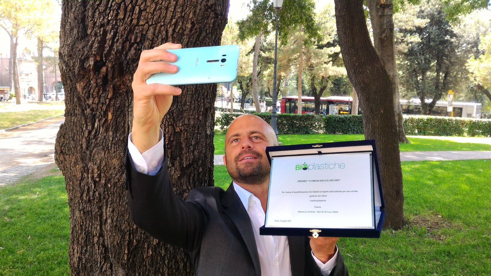 23 giugno - Luca Abete ha ricevuto oggi a Roma il premio Assobioplastiche per Comuni Ricicloni 2016. Comuni Ricicloni è l´iniziativa di Legambiente, patrocinata dal Ministero per l´Ambiente, che premia le comunità locali, gli amministratori e i cittadini che hanno ottenuto i migliori risultati nella gestione dei rifiuti e che più si sono impegnati per la promozione e la diffusione di comportamenti virtuosi. La premiazione si è svolta oggi a Roma, 23 giugno, all’interno della tre giorni del Forum Rifiuti alla Casa del Cinema di L.go Marcello Mastroianni, Roma.
