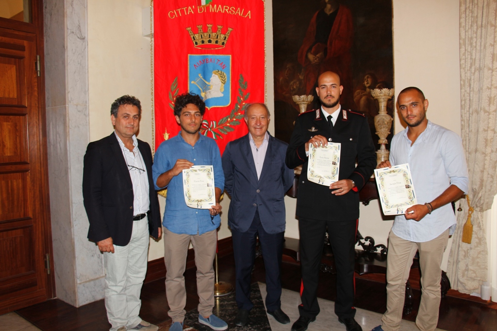 Il Sindaco Alberto Di Girolamo ha ricevuto stamani al palazzo Municipale, presenti il suo vice Agostino Licari e il consigliere comunale Daniele Nuccio, i tre sub che nel pomeriggio di domenica 19 giugno u.s. hanno salvato una donna che si era gettata in mare con la sua auto nel tentativo di togliersi la vita. Si tratta del maresciallo dei carabinieri Ezio Parisi e dei fratelli Sergio e Flavio Fina. Ai tre giovani il Sindaco ha consegnato una pergamena ringraziandoli a nome della città “perché con coraggio, freddezza, prontezza d’intervento e a rischio della propria incolumità, hanno tratto in salvo una donna in imminente pericolo di vita”. Ezio Parisi era accompagnato dal maresciallo Francesco barbera in rappresentanza della locale Compagnia dei Carabinieri.