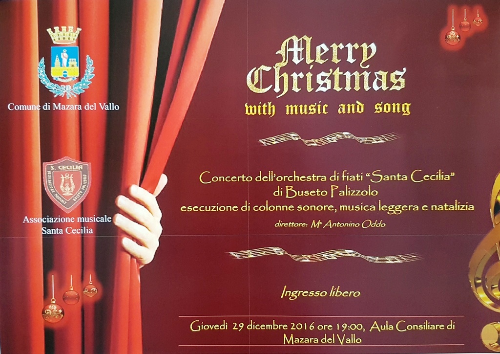 ore 18-24 Piazzetta San Bartolomeo, piazza Modica, Via Porta Palermo - Presepe Vivente, Artigianato artistico, degustazioni, mostre di pittura, animazione per bambini, artisti di strada (organizzati dal Centro Studi “Gaspare Morello”). 29 Dicembre 2016: ore 17,30 Piazza Immacolata: Apertura Villaggio di Santa Claus, il The con Peppa Pig con foto e momenti ricreativi per i bambini. Ore 19,00 ‘Aperitivo Scientifico’ con la fisica Sabrina Maniscalco che incontra adulti e giovanissimi dialogando sul tema: “e l’Universo …??” (Canto del Marrobbio) ore 18-24 Piazzetta San Bartolomeo, piazza Modica, Via Porta Palermo - Presepe Vivente, Artigianato artistico, degustazioni, mostre di pittura, animazione per bambini, artisti di strada (organizzati dal Centro Studi “Gaspare Morello”). ore 18,00 Piazza Mokarta: spettacolo musicale a cura degli allievi dello Smakko’s Club organizzato dall’Associazione Italiana per la solidarietà di Mazara del Vallo. ore 19,00 Aula Consiliare ‘Merry Christmas with music and song’, Concerto dell´orchestra di fiati ´Santa Cecilia´ di Buseto Palizzolo, esecuzione di colonne sonore, musica leggera e natalizia. Organizzato da Associazione Musicale Santa Cecilia Si ricorda inoltre che sotto i portici di Piazza della Repubblica è stato istallato un Pianoforte a coda di colore bianco con inserito al suo interno un pianoforte digitale messo a disposizione dei cittadini (Maison de la Musique), mentre proseguono i Mercatini di Natale in Corso Umberto I e in Piazza della Repubblica.