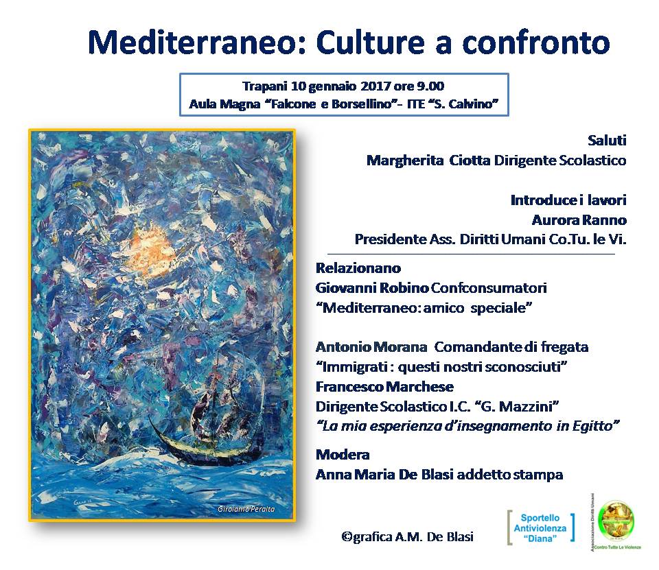 Riprendono, il 10 gennaio 2017 alle ore 9.00 presso l´ITE "S. Calvino di Trapani, gli incontri per il progetto "Mediterraneo: Culture a confronto" dell´Associazione Diritti Umani Contro Tutte le Violenze e dello Sportello Antiviolenza "Diana". Parteciperanno all´incontro gli studenti dell’Istituto Comprensivo "L. Bassi - S. Catalano", dell’Istituto Tecnico Economico “S. Calvino”, dell’Istituto Comprensivo “G. Pagoto” e della Scuola Media Statale "A. De Stefano" di Trapani. Dopo i saluti del Dirigente Scolastico M. Ciotta, aprirà i lavori la Presidente dell´ Associazione Diritti Umani Co.Tu. le Vi. Palma Camelia Aurora Ranno. A trattare il tema, ciascuno dal proprio punto di vista, saranno il dott. Giovanni Robino di Confconsumatori, il Capitano di fregata Antonino Morana, Francesco Marchese Dirigente Scolastico I.C. “G. Mazzini”, modererà l´incontro l´addetto stampa Anna Maria De Blasi. Dopo gli esiti positivi, raccolti nei sei incontri-dibattito realizzati tra novembre e dicembre 2016, ci si appresta ad entrare nella fase progettuale ricca di eventi che prevedono il coinvolgimento di tanti relatori facente parte a vario titolo delle Istituzioni locali e non solo. L’addetto stampa Anna Maria De Blasi Associazione Diritti Umani “Contro Tutte le Violenze”