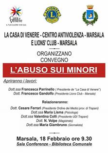 Importanti appuntamenti di valenza sociale e culturale in programma a Marsala nei prossimi giorni, che si avvalgono del patrocinio dell´Amministrazione comunale. Sabato prossimo, 18 febbraio, il tema sarà “L´abuso sui minori”. Il convegno è organizzato dal Centro Antiviolenza "La Casa di Venere" e dal “Lions Club” di Marsala, rispettivamente presieduti da Francesca Parrinello E Francesco Gandolfo. Nel corso del Convegno – Biblioteca comunale, ore 9,30 – le relazioni verteranno anche sulla violenza consumata tra le pareti domestiche, spesso sottaciuta o addirittura ignorata.