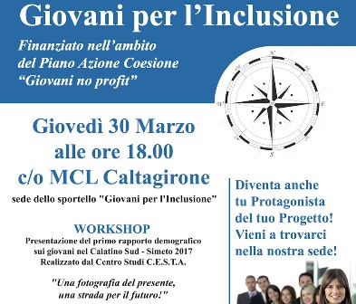 Il prossimo 30 marzo alle ore 18.00 nella sede dello sportello di via Roma n°215 di Caltagirone, nel corso del workshop organizzato all’interno del progetto “Giovani per l’Inclusione” – Finanziato nell’ambito del Piano Azione Coesione “Giovani no profit”- , sarà presentato il Primo rapporto demografico sui giovani del Calatino Sud-Simeto 2017 dal titolo “Una fotografia del presente, una strada per il futuro!”. L’indagine, realizzata del Centro Studi C.E.S.T.A., offre un quadro di insieme sulla situazione demografica del Calatino, con particolare riferimento ai giovani della fascia 14-35 anni, e si pone come oggetto di riflessione sulla fotografia attuale in termini di presenza giovanile nei 15 comuni del Calatino, ma anche un punto di partenza per nuove ricerche sul territorio. Nel corso dell’evento sarà, inoltre presentato uno studio sul rating territoriale, ossia l’indicatore che valuta lo sviluppo del territorio, e la FIL – Felicità Interna Lorda – che valuta il livello di soddisfazione tout court dei giovani del Calatino. Interverranno: Giuseppe Biazzo, Coordinatore della ricerca; Paolo Ragusa, Presidente del Centro Studi C.E.S.T.A.; Martina Scimonetti, Sociologa dell’equipe del progetto “Giovani per l’Inclusione”; e Florinda Perrotta, Consigliere di “Agenzia Giovani per i Giovani”.