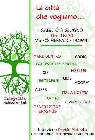 "Riteniamo che la democrazia e la Cittadinanza consapevole si basino su dei punti fondamentali: Istituzioni, Legalità, Territorio, Memoria. Sabato 3 giugno alle 16.30 in via XXX Gennaio, Abbiamo quindi deciso di radunare tutte le associazioni trapanesi che con noi condividono questi valori (Italia Nostra, Leo Club, AUSR, Kiwanis Erice, Agorà, Trapani per il Futuro, Unitrapani, ANMIC, Codici, Badia Grande, Global Services Mobility, Solidalia, “Mare Dentro”), ed effettuare la riqualificazione dell’aiuola posta davanti il parcheggio del Tribunale di Trapani, luogo della legalità e della Legge per eccellenza. Ogni associazione porterà una piantina di rosmarino da dedicare ad un uomo/donna che si è occupato della Legalità e del contrasto alla mafia. Tutti insieme, dedicheremo un albero di ulivo alla memoria di S.E. Fulvio Sodano, Prefetto di Trapani. Anche grazie alla presenza dell´on. Davide Mattiello della Commissione Parlamentare Antimafia, intendiamo affermare che questa Città debba pretendere una politica le cui precondizioni siano onestà e trasparenza, che non siano abdicabili nè derogabili: per questo chiederemo agli aspiranti amministratori di sottoscrivere pubblicamente il documento di autoregolamentazione della Commissione Antimafia. "Noi non vogliamo trovare un posto in questa società, ma creare una società in cui valga la pena trovare un posto": vogliamo che i nostri giovani trovino ispirazione nelle parole di Mauro Rostagno, non negli slogan di un sistema politico, culturale e sociale che tutto giustifica e normalizza, tramutando le speranze in clientele.
