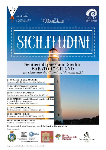 Al chiostro dell’Ex convento del Carmine di Marsala a partire dalle ore 21.00 avrà luogo Letti di Notte la Notte del libro e della lettura, l’Associazione OTIUM, che aderisce all’iniziativa nazionale per il terzo anno consecutivo, propone per l’edizione 2017 dedicata al tema del sogno e dei sognatori, un programma dal titoli “Sicilitudini” un percorso di poesia siciliana contemporanea, nella certezza che la poesia rappresenti ancora un sogno importate per l’umanità. L’evento si realizza con il patrocinino dell’Assessorato alle Politiche Culturali e Sociali del Comune di Marsala, guidato da Clara Ruggeri; con il supporto del Club per l’Unesco di Marsala guidato da Cesarina Perrone; con il contributo dalle Associazioni Culturali: Banca Marsalese delle Memoria e Istantenee, guidate da Francesco Tranchida e Antonella Genna. Il programma prevede un percorso nella poesia siciliana contemporanea, ospiti quattro giovani poeti che leggeranno e narreranno i loro componimenti. Ci intratterremo in più tappe con: Noemi De Lisi, da Palermo; Carola D’Andrea, da Mazara del Vallo; Antonio Lanza da Biancavilla, Vincenzo Galvagno da Catania.