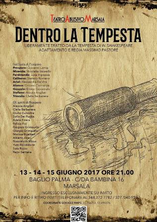 Andrà in scena il 13, il 14 e il 15 giugno alle ore 21 al Baglio Palma, in contrada Bambina a Marsala, il nuovo spettacolo del TAM - Teatro Abusivo Marsala - liberamente tratto da "La tempesta" di William Shakespeare.