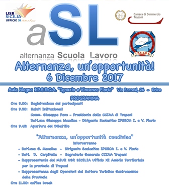 La Camera di Commercio IAA di Trapani in Collaborazione con l’istituto IPSOEA di Erice realizzerà Il giorno 6 dicembre p.v. alle ore 9 presso l’Aula Magna dell’istituto Alberghiero (IPSOEA) di Erice l’Incontro intitolato “Alternanza, un’opportunità!”.